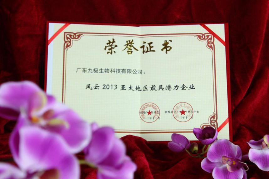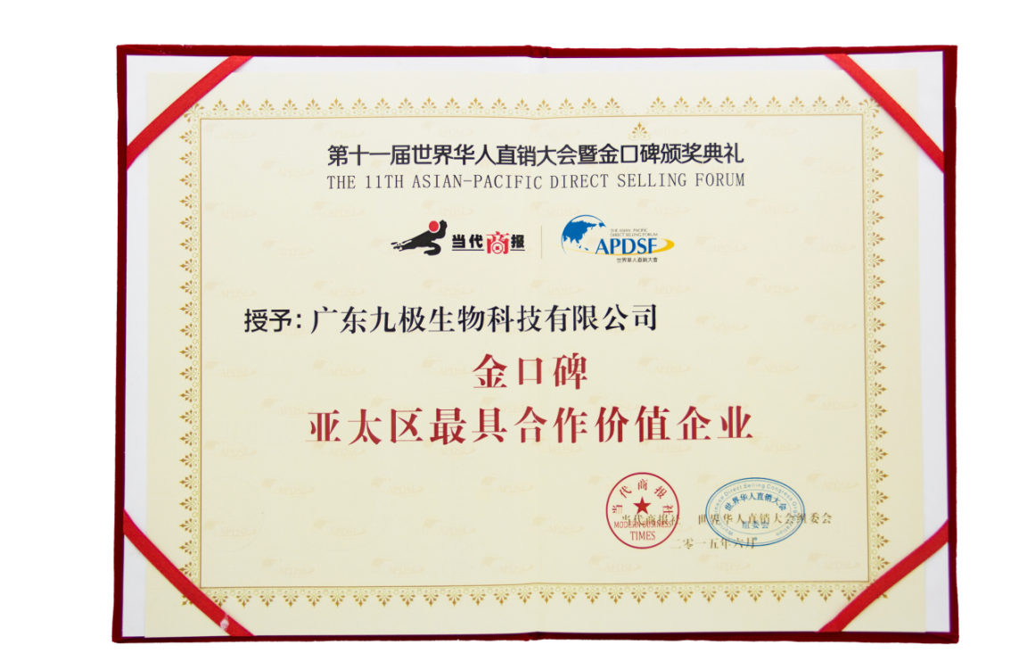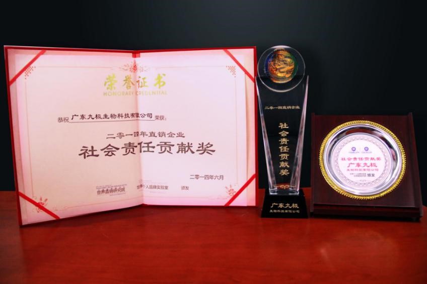 近年來,九極產(chǎn)品獲得了廣大消費(fèi)者厚愛和好評(píng),獲得風(fēng)云2013亞太地區(qū)最具潛力企業(yè)獎(jiǎng)、2014直銷企業(yè)社會(huì)責(zé)任貢獻(xiàn)獎(jiǎng)、金口碑亞太區(qū)最具合作價(jià)值企業(yè)獎(jiǎng)等眾多殊榮,也被認(rèn)定為“廣州市高新技術(shù)企業(yè)”。