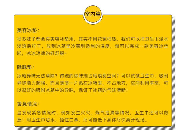 它還可以當(dāng)眼罩、口罩、退熱貼、鼠標(biāo)墊等。九極MM衛(wèi)生巾,多種用途,居家旅行必備佳品!