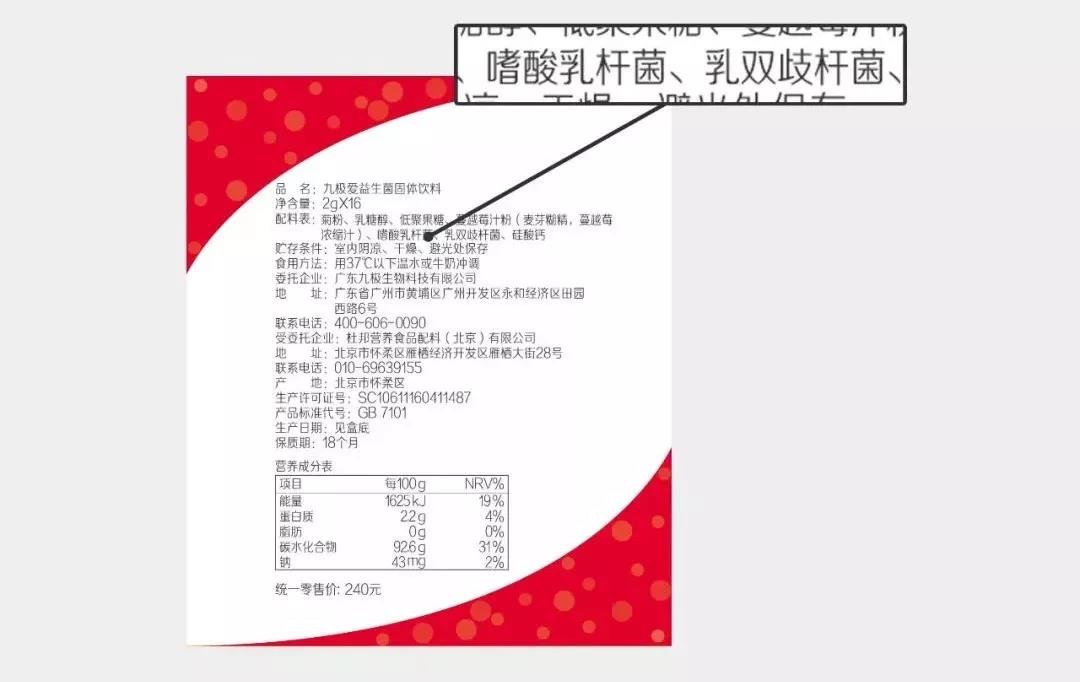 九極愛(ài)益生菌產(chǎn)品配料表上明確標(biāo)示著菌種菌株: